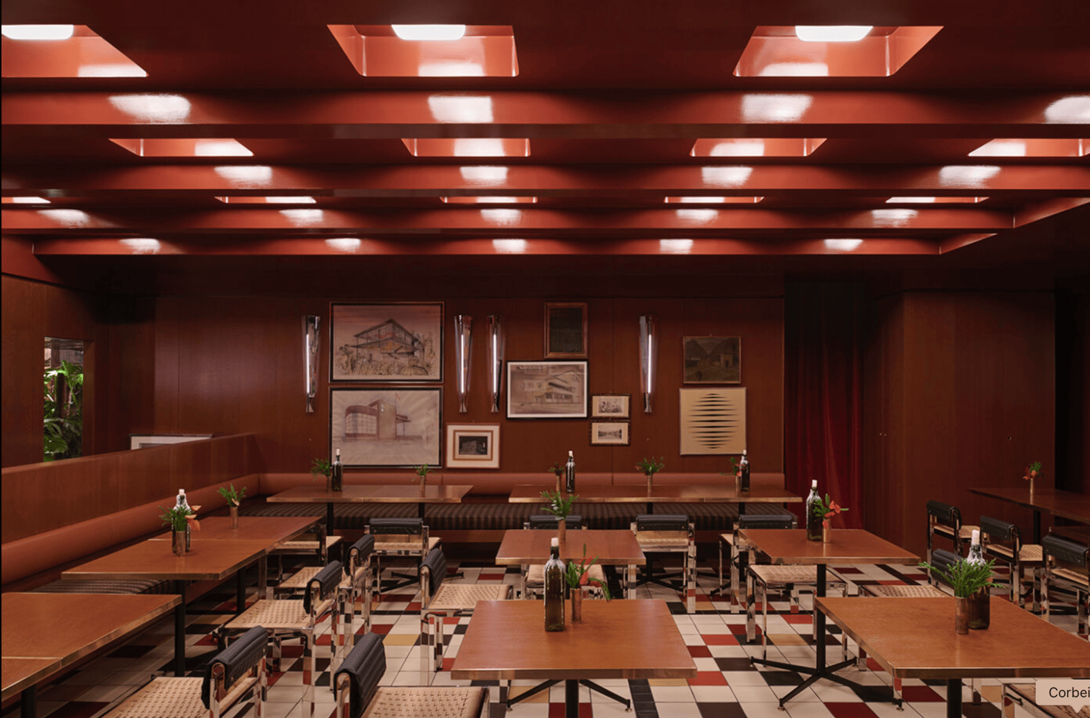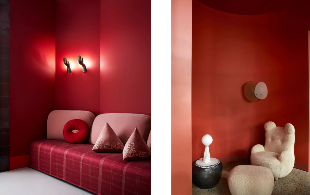 India Mahdavi, elle, marie ces rouges sombres à des beiges poudrés et ors mats, pour créer des espaces à la fois sensuels et apaisés — des cocons suspendus hors du temps. Elle a déjà travaillé des gammes de rouges profonds, notamment dans le restaurant The Gallery à Londres.