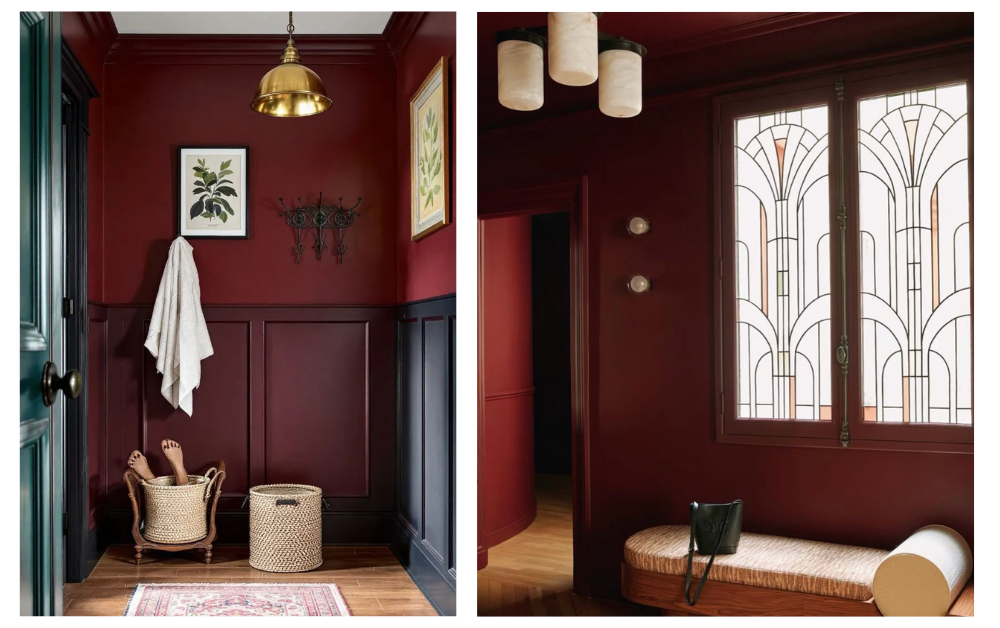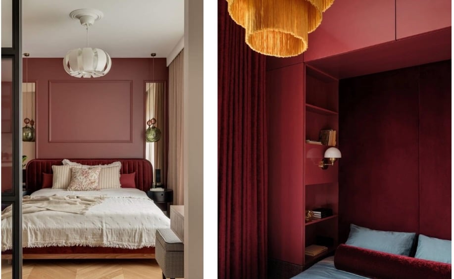 Dans une chambre, un mur grenat ou une tête de lit en velours crée un sentiment d’intimité et de sécurité. C’est une couleur protectrice, propice au relâchement. Parce qu’il évoque la chaleur, la protection et la matière, le grenat peut apaiser et ancrer.